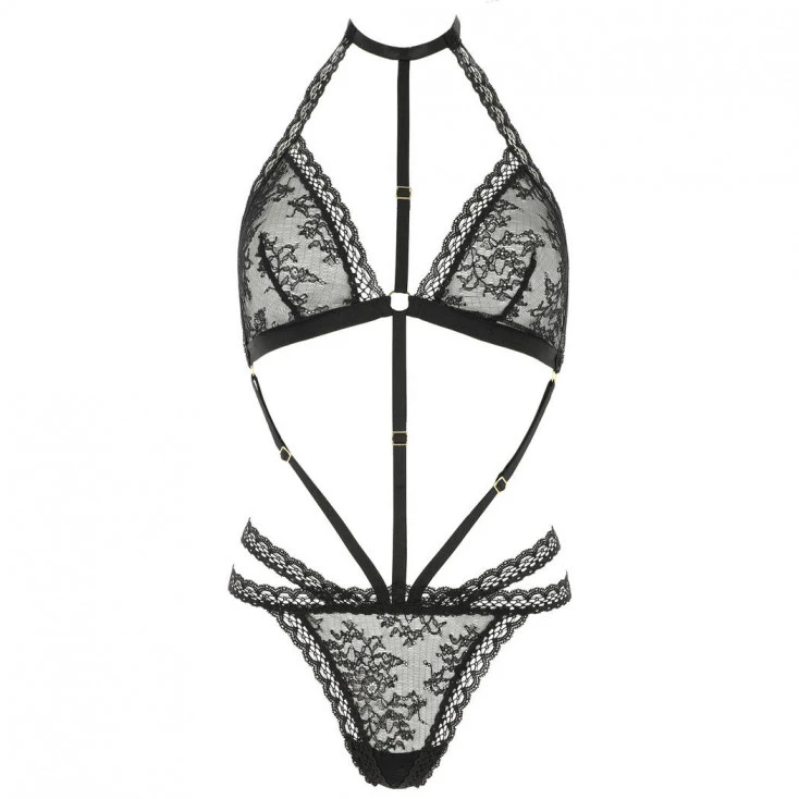Dentelle et bandes ajustables retiennent votre sensualité tandis qu’à l’avant les brides graphiques à coulisse à l’effet bondage forment un écrin à vos formes nues, retenues dans un anneau doré aux allures de bijou.