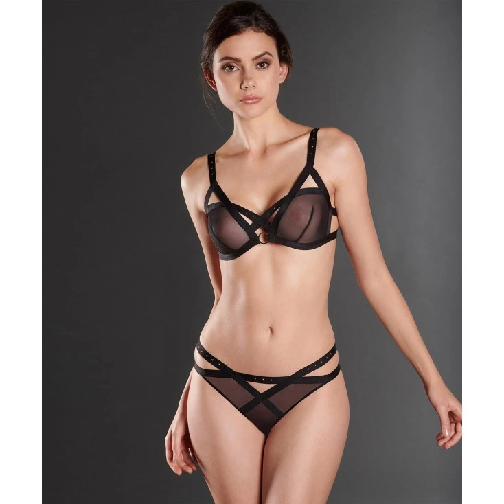 Le désir est au cœur de cette culotte ouverte imaginée pour la ligne ‘Rencontre Anonyme’ où la nudité s’exprime avec délice sous un tulle noir transparent.