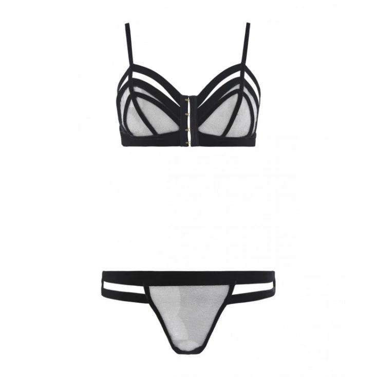 Cet ensemble de lingerie, chic et glamour, est composé de bandes de velours de différentes largeurs, de tulle transparent et de boucleries dorées.