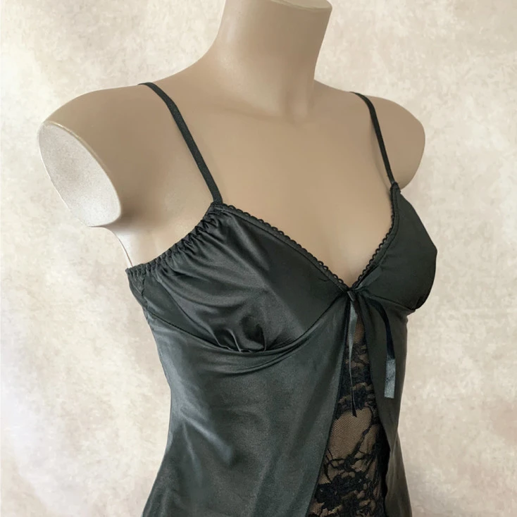 Un empiècement à la brillance satinée vient se poser sur la poitrine, pour retomber sur les hanches tel un voile de sensualité. Un noeud de ruban fin en satin vient se loger au creux des seins, pour décorer le décolleté d’un détail coquin tout en maintenant la pièce de lingerie fine.