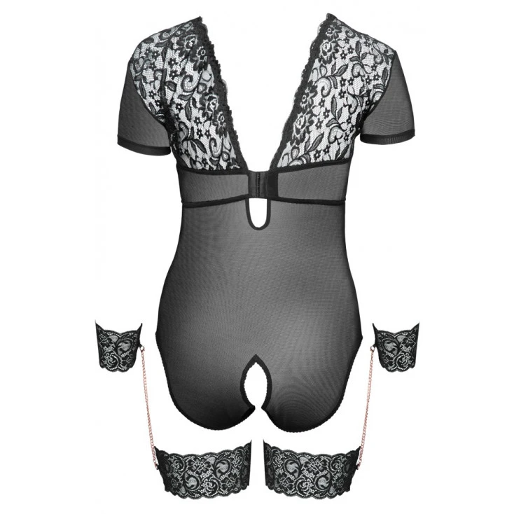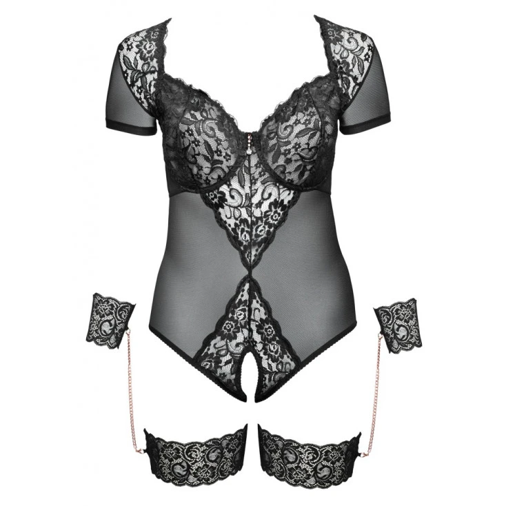 Sexy et provocant, le body ouvert en dentelle noire propose des menottes érotiques pour rendre vos moments coquins plus excitants encore.