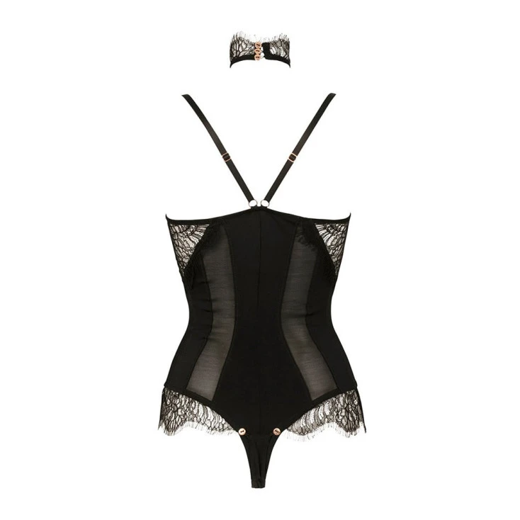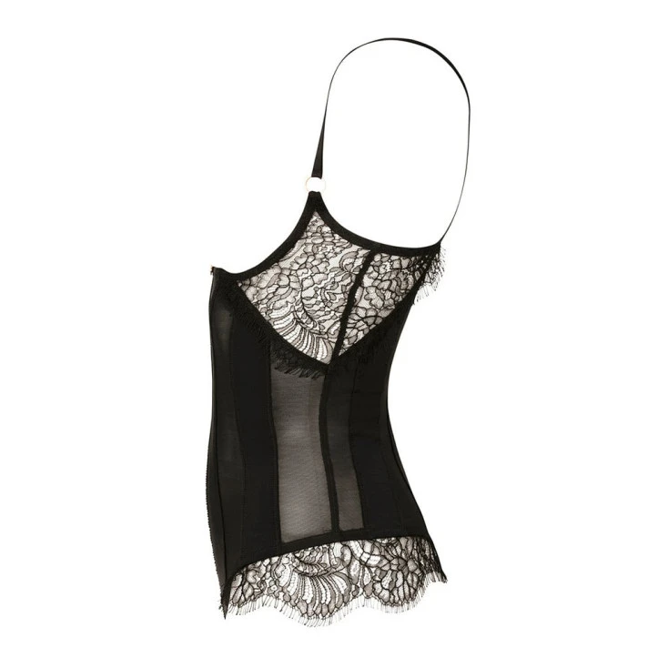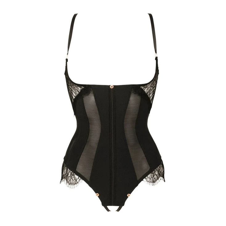 Le somptueux body ouvert sur les seins se pare de dentelle de Calais sur les côtés de la poitrine et sur les hanches, tout en sculptant vos formes féminines avec délice.