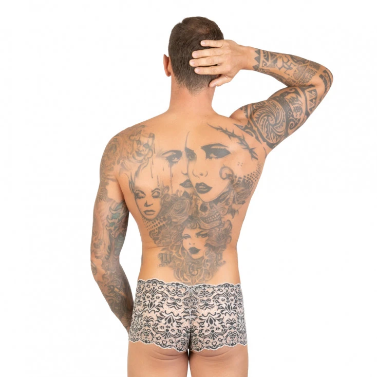 Ce boxer composé de dentelle florale noir et beige est une création de la marque de lingerie masculine Eros Veneziani.