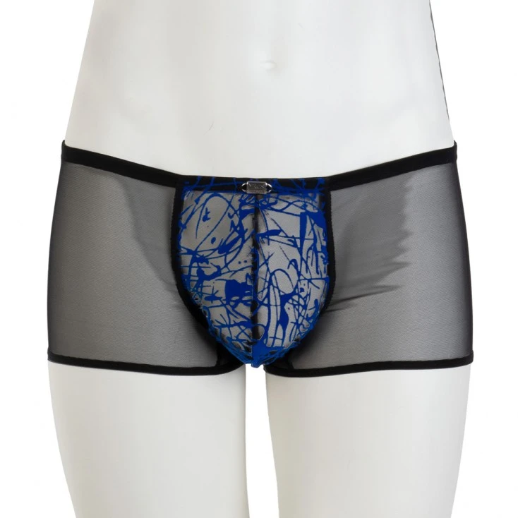Ce boxer push-up en tulle transparent noir et flocage en velours bleu est une création de la marque de lingerie italienne Eros Veneziani.