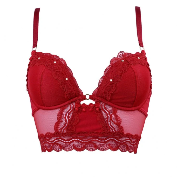 On aime la forme plongeante de ce bustier Képi aux bonnets pleins, la mousse préformée recouverte de tulle rouge et de galon de dentelle vous offre un décolleté pigeonnant pour des courbes sublimées.