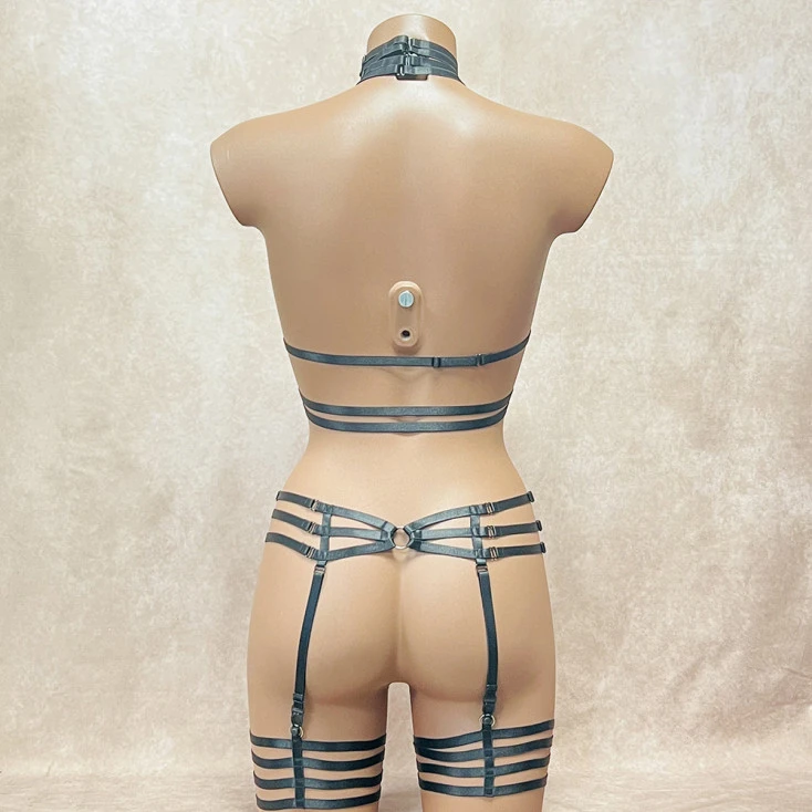 • Inclus : Un top harnais ouvert, un porte-jarretelles avec jarretières intégrées.