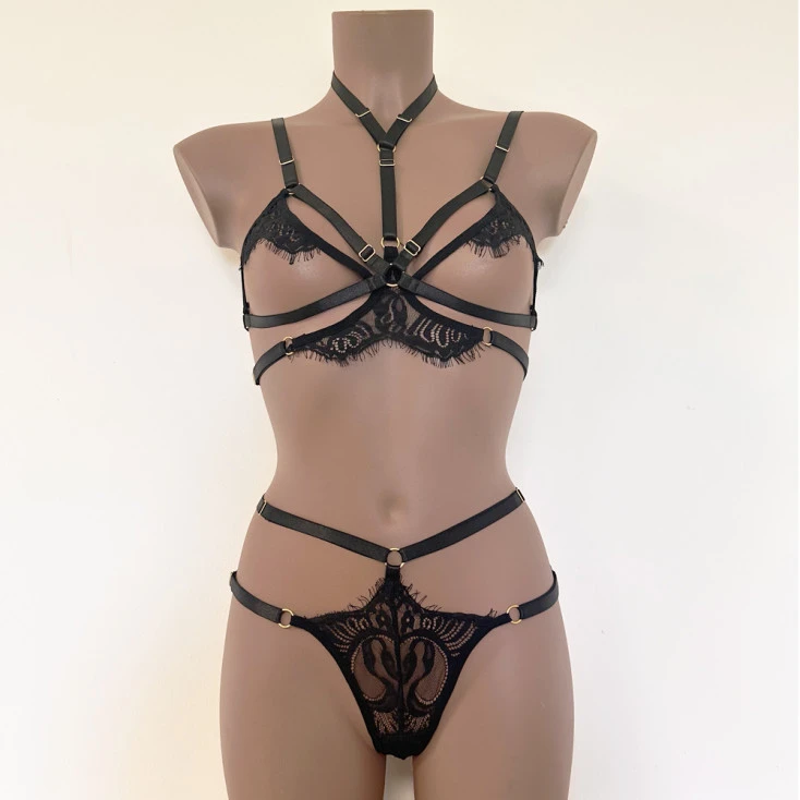 • Inclus : Un soutien-gorge ouvert sur les seins, un string, un harnais.