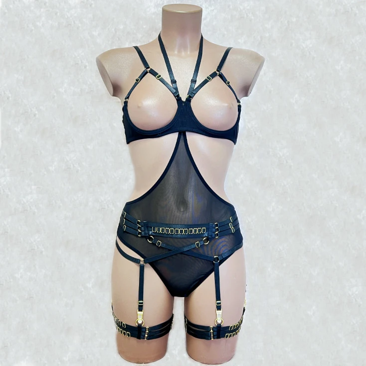 • Inclus : Un soutien-gorge à armatures ouvert sur les seins, un porte-jarretelles, un body string ouvert sur les fesses, une paire de jarretières.