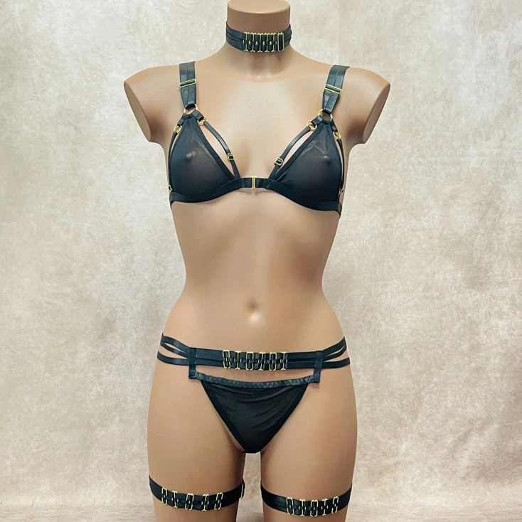 Le soutien-gorge triangle enserre votre poitrine de brides extensibles, tandis qu’une culotte ouverte sur les fesses vous invite à vivre des plaisirs osés.
