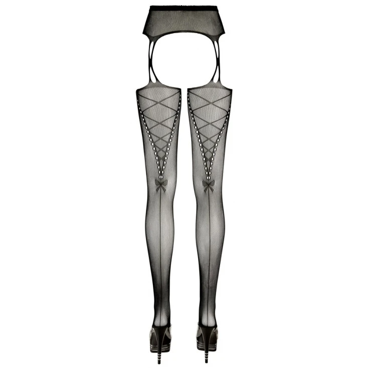 À l’arrière des collants apparaissent des motifs tissés en forme de lacets qui s’entrecroisent en prenant la forme d’un corsage envoûtant et chic à souhait.