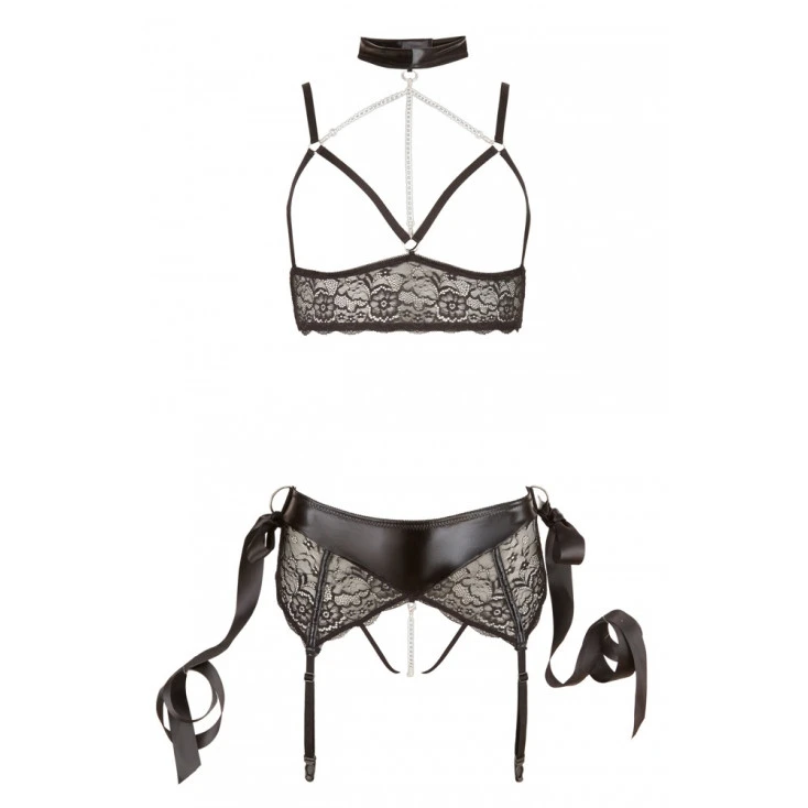 Dentelle, similicuir, chaînes et rubans s’entremêlent harmonieusement sur cette parure somptueuse et provocatrice. Le soutien-gorge ouvert libère entièrement votre poitrine, tout en cumulant les détails outrageusement excitants comme les trois chaînes argentées qui viennent se croiser au-dessus de vos seins tels des bijoux érotiques. Un collier en similicuir enserre fermement votre cou pour rejoindre les chaînes de ce soutien-gorge audacieux aux bretelles réglables.