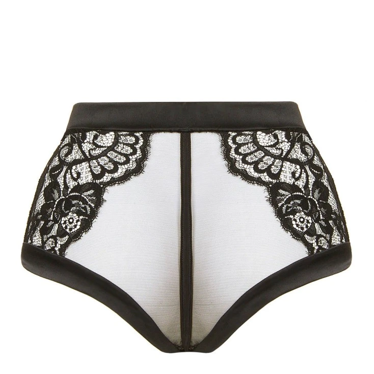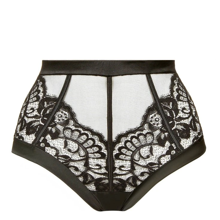 Romantique et sexy, la culotte taille haute en dentelle florale et tulle noir sublime la silhouette à travers un jeu de transparences des plus mutins.
