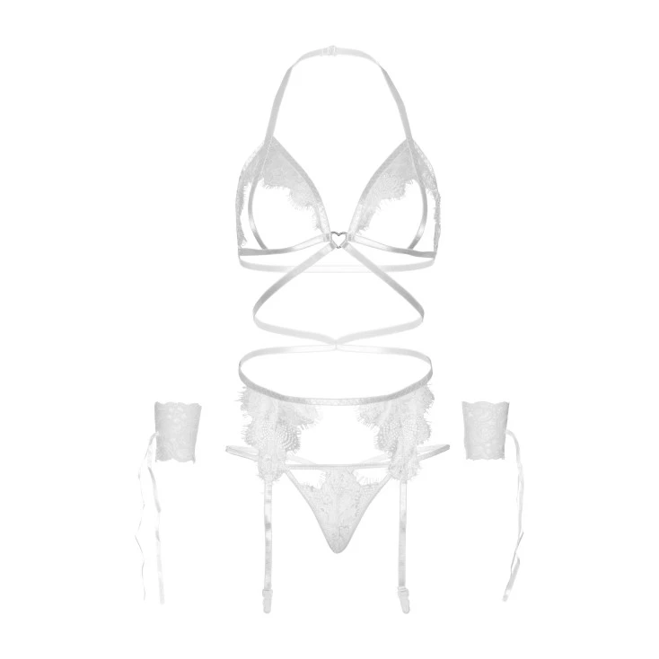Le soutien-gorge ouvert arbore un jeu de brides extrêmement sensuel pour retenir vos formes féminines, tandis qu’un petit bijou en forme de cœur vient marquer le creux des seins et maintenir la pièce de charme.