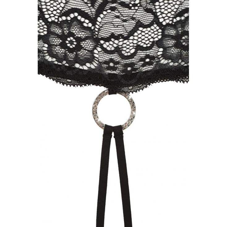 Empiècements de dentelle et brides se rejoignent en son centre et sont maintenus par un anneau bijou, pièce désirable qui attire le regard… Dentelle florale couvre en partie la poitrine pour laisser libre cours à vos désirs.