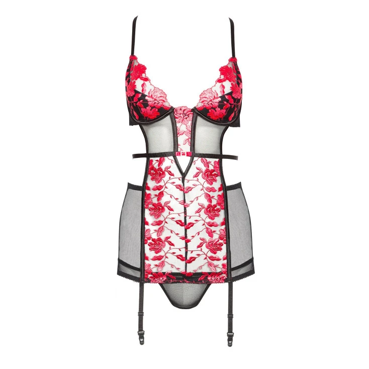 Une bride avec une attache sur la nuque ainsi qu’une rangée de deux agrafes au dos permettent d’ajuster la guêpière irrésistible, tandis que le mini string assorti vient compléter cette parure magnifique.