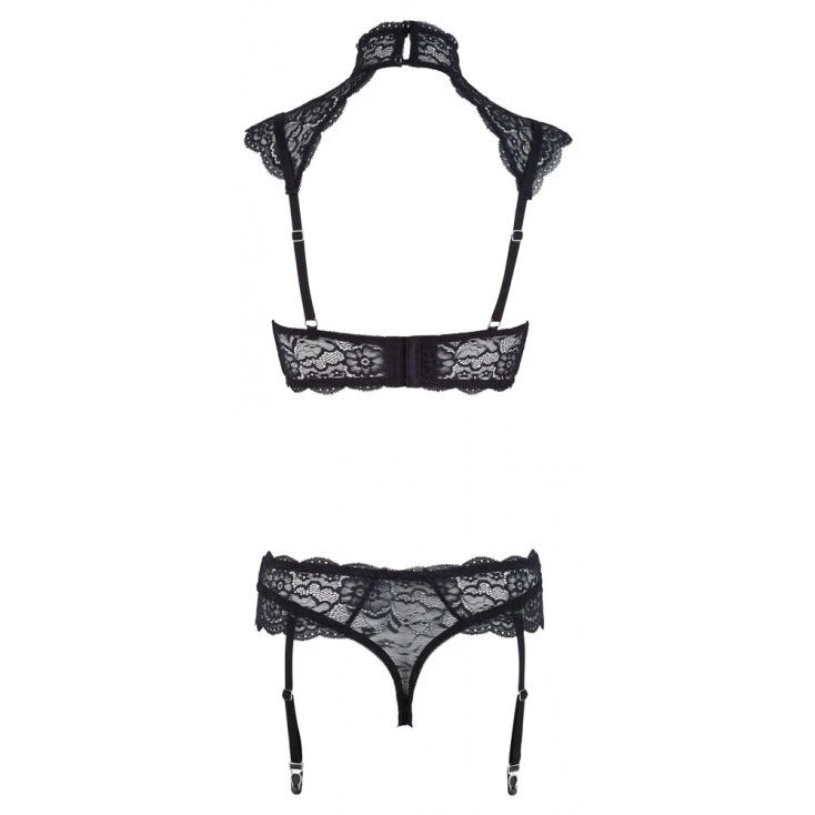 L’ensemble se compose d’un soutien-gorge harnais, avec col montant et d’un string avec porte-jarretelles.