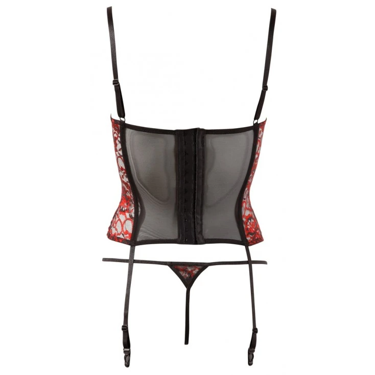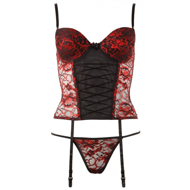 Très audacieuse, cette guêpière dessinée par la Maison Cottelli Collection retient les courbes captives dans une dentelle florale rouge passion, qui suggère la peau.