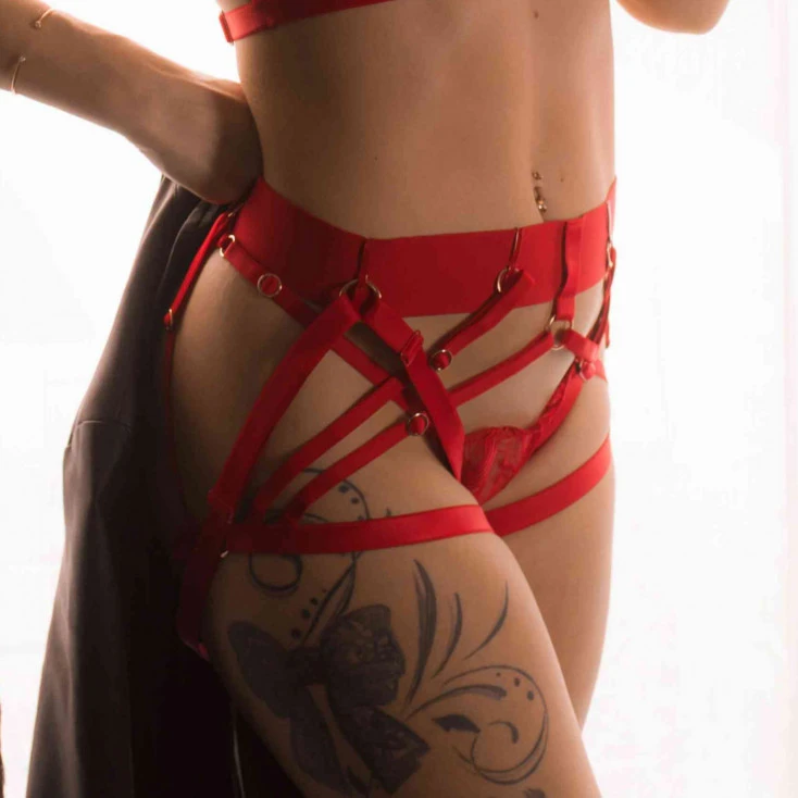 L’accessoire de corps fascine et trouble les esprits par son jeu d’élastiques ultra sexy venant s’entrelacer autour des cuisses, tout en soulignant le courbé des fesses avec un charme hypnotisant.