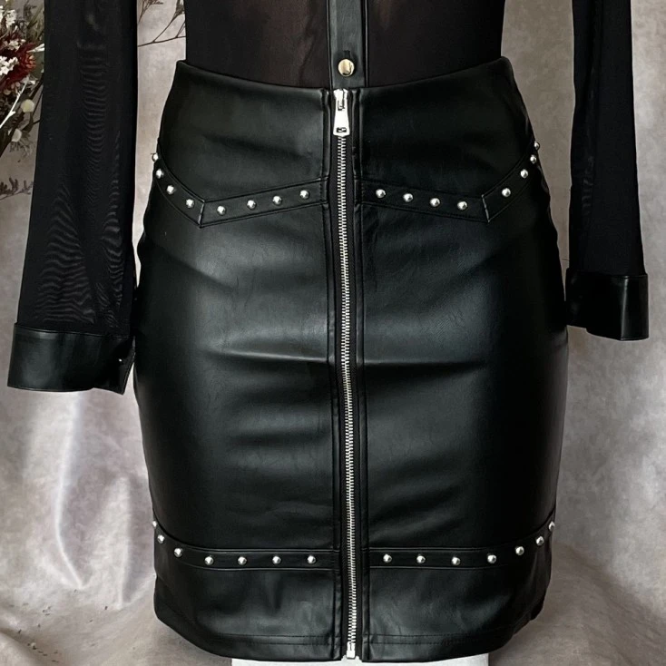 Véritable tenue sexy au service de votre féminité, cette jupe cloutée en simili au zip terriblement coquin donne à voir un aspect rock de votre personnalité.
