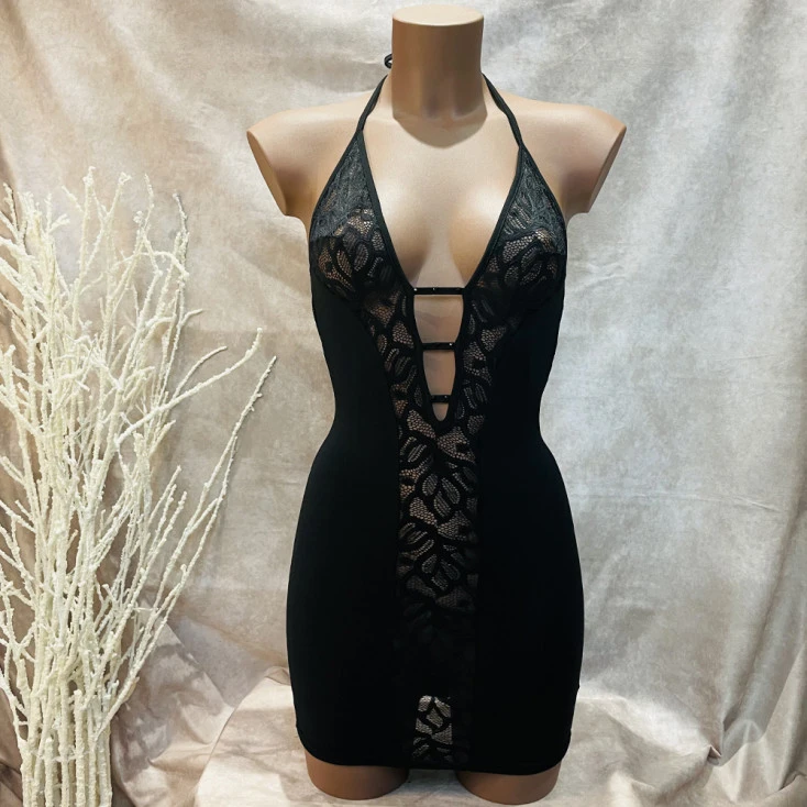 La fermeture s’effectue dans la nuque à l’aide d’un lien qui se noue. La coupe courte de la pièce de prêt-à-porter sexy redessine votre silhouette avec charme.