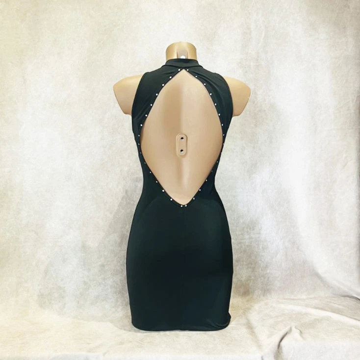 Une ouverture sur le creux des seins offre à voir un décolleté ouvert des plus séduisants, maintenu par un bijou apportant une touche de glamour exquise.