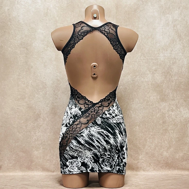L’imprimé noir et blanc épouse les formes et habille le corps d’une élégance délicieuse, tandis qu’une bande de dentelle florale rejoint la pièce de charme, partant de sous la poitrine pour ensuite enlacer la taille dans un tourbillon de sensualité.