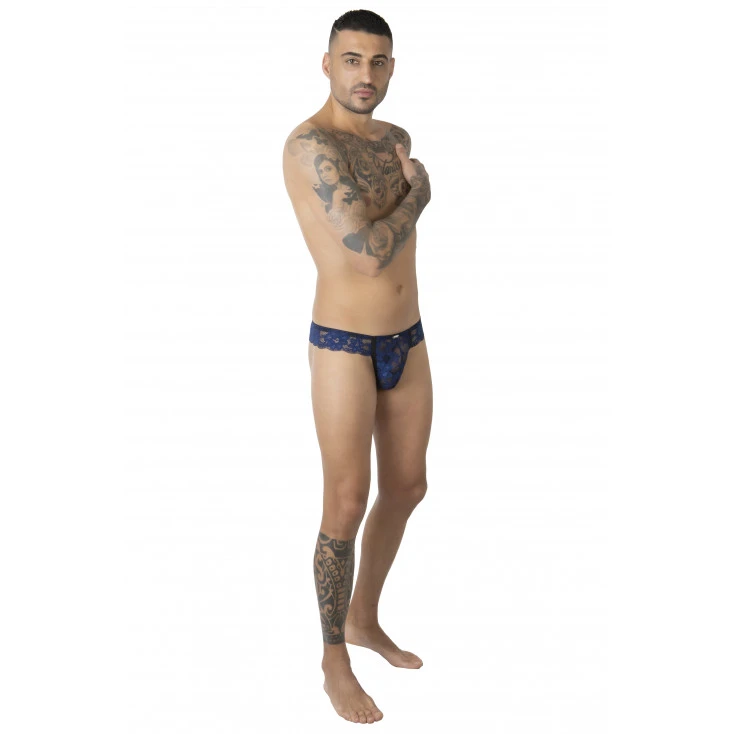 Le slip brésilien en dentelle bleue a été imaginé par Eros Veneziani pour flatter la silhouette masculine et lui permettre de dévoiler son potentiel séduction.