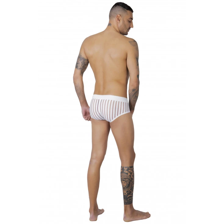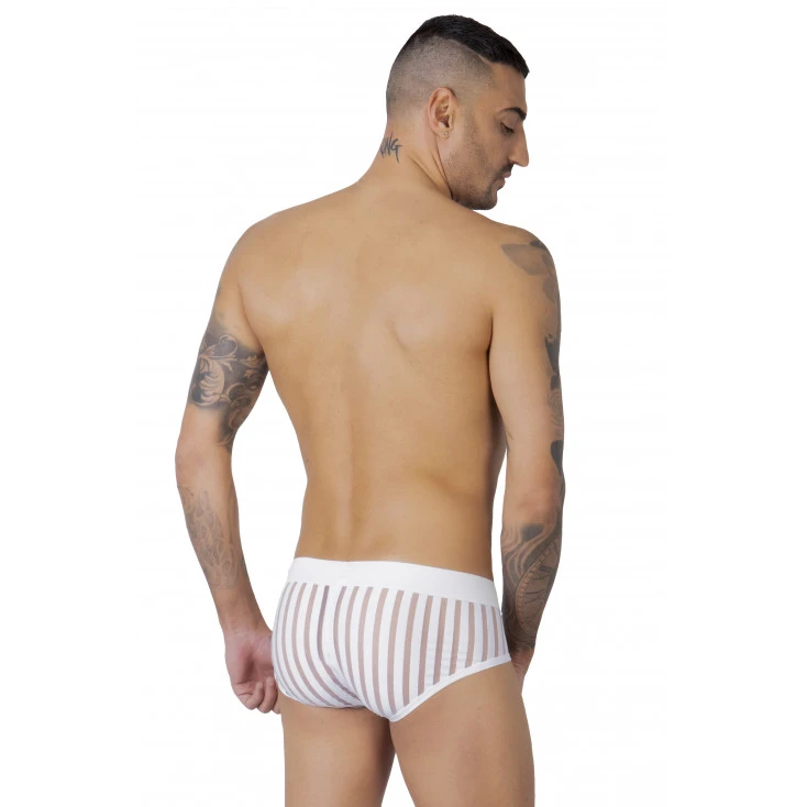 Eros Veneziani a imaginé ce modèle torride en alternant les lignes de tissu en coton blanc et tulle transparent laissant entrevoir vos atouts masculins mis en valeur avec efficacité.