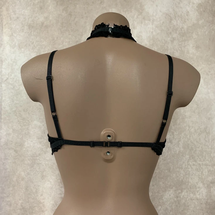 Le soutien-gorge irrésistible peut être attaché à son harnais assorti, afin d’ajouter une dimension torride supplémentaire. Ce dernier fait lascivement le tour du cou pour ensuite retomber au creux du décolleté, dans un rendu visuel graphique et terriblement sexy.