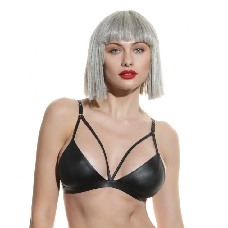 Le soutien-gorge triangle ‘Clandestine’ propose des bonnets en wetlook à la forme triangle qui enveloppent la poitrine, une bride enserre le haut de chaque bonnet donnant à voir un écrin rock et sensuel à la fois.
