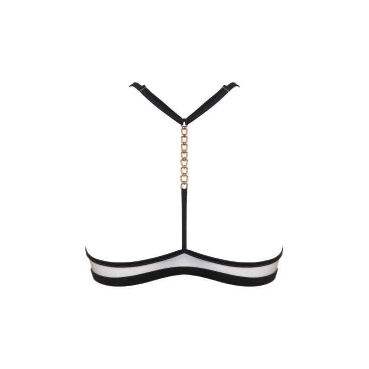 D’une finesse irréfutable, un empiècement en tulle de couleur chair joue sur un effet trompe l’œil, pour voiler les seins d’une transparence exquise et envelopper la nudité dans un écrin à la beauté irrésistible.