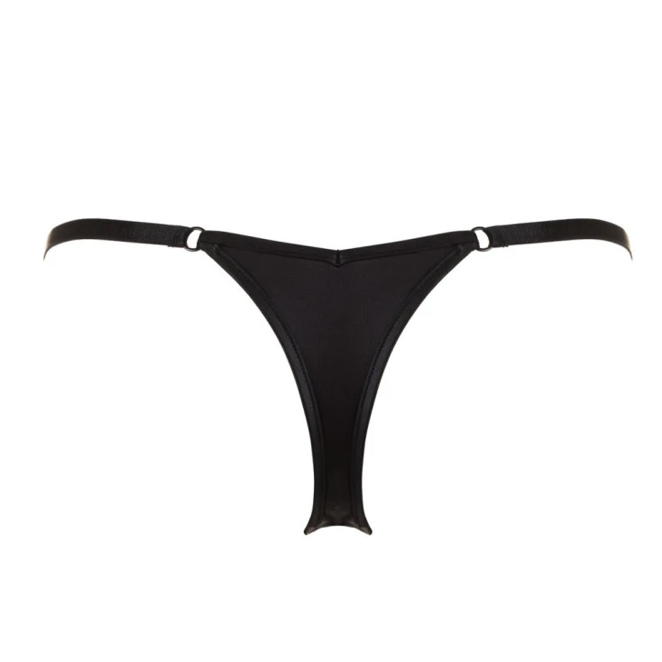 Confectionné à partir d’un wetlook envoûtant, le dessous féminin voile l’intimité d’un noir obscur somptueux, tandis que des fines brides s’apposent sur les hanches dans un ajustement parfait.