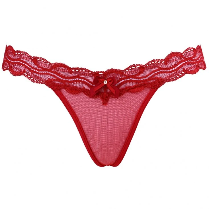 Un nœud double en bi-matière rouge surmonté d’un strass Swaroski vient pointer le cœur de la pièce et attire le regard sur votre entrejambe, objet de tous les désirs.