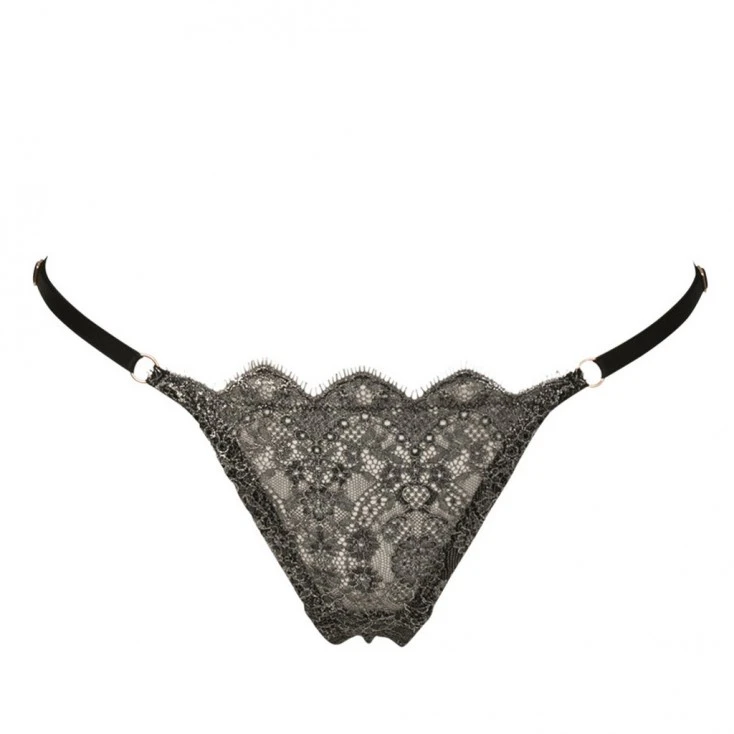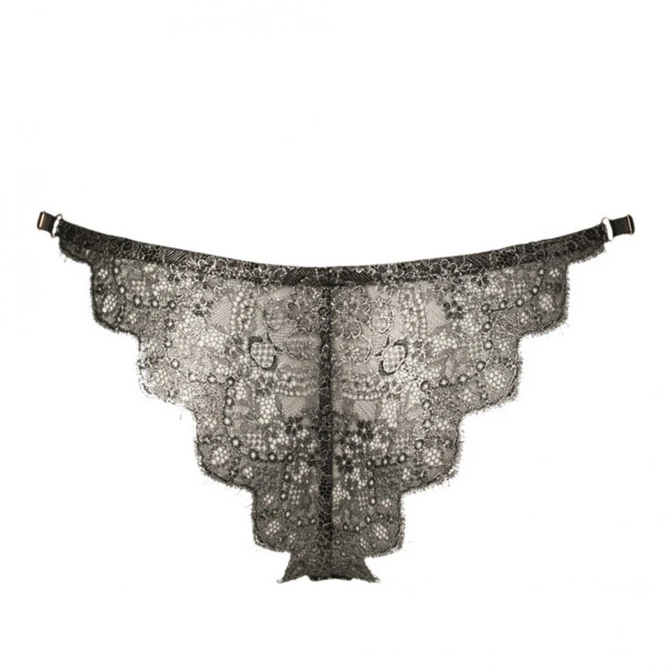 A l’avant comme à l’arrière, la dentelle festonnée dévoile votre nudité avec audace tandis que des brides fines et extensibles maintiennent la lingerie fine sur vos hanches.