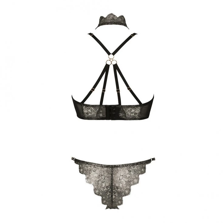 Composée de broderie et de dentelle à cils grises aux reflets argents irisés, la lingerie sensuelle se révèle avec un fort potentiel érotique.