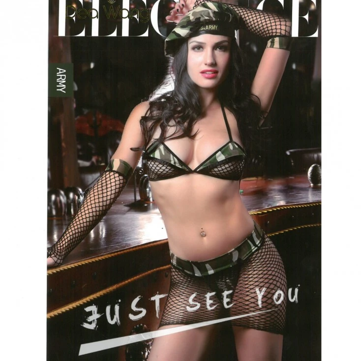 Composée d’un soutien-gorge et d’une mini jupe le tout en résille et toile militaire, la tenue coquine dessine vos courbes de manière assumée.