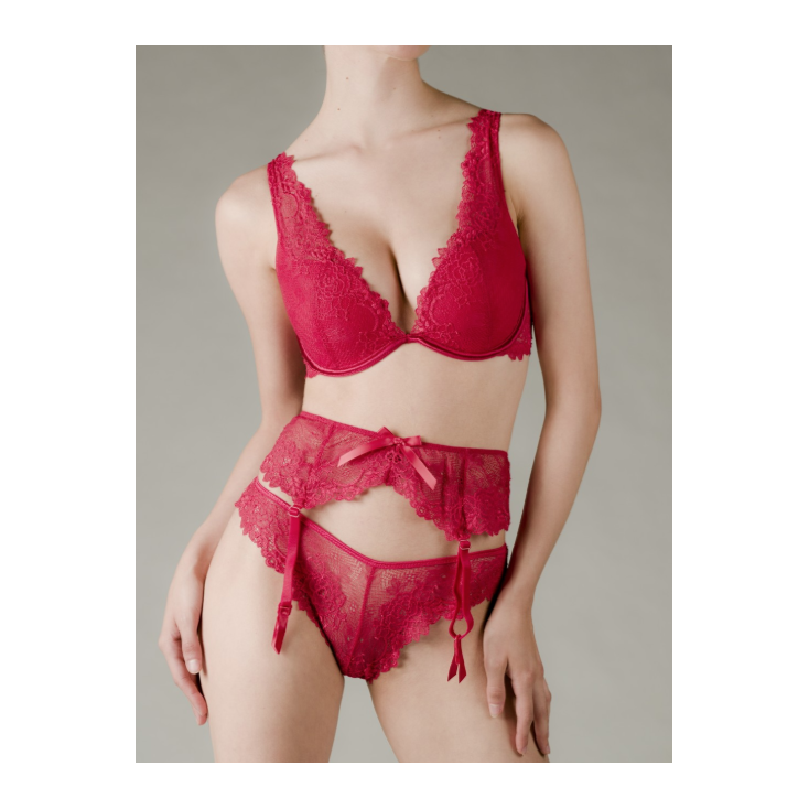 La ligne Dahalia propose un jeu de transparence pour une silhouette qui oscille entre trois coloris, rouge passion, noir profond et blanc intemporel; pièce de choix à un prix tout doux.