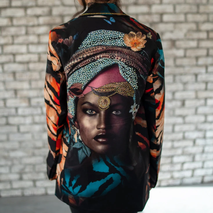 La veste chic et somptueuse donne à voir un col à revers décoré de strass lumineux, en plus d’arborer un décolleté plongeant extrêmement sexy.